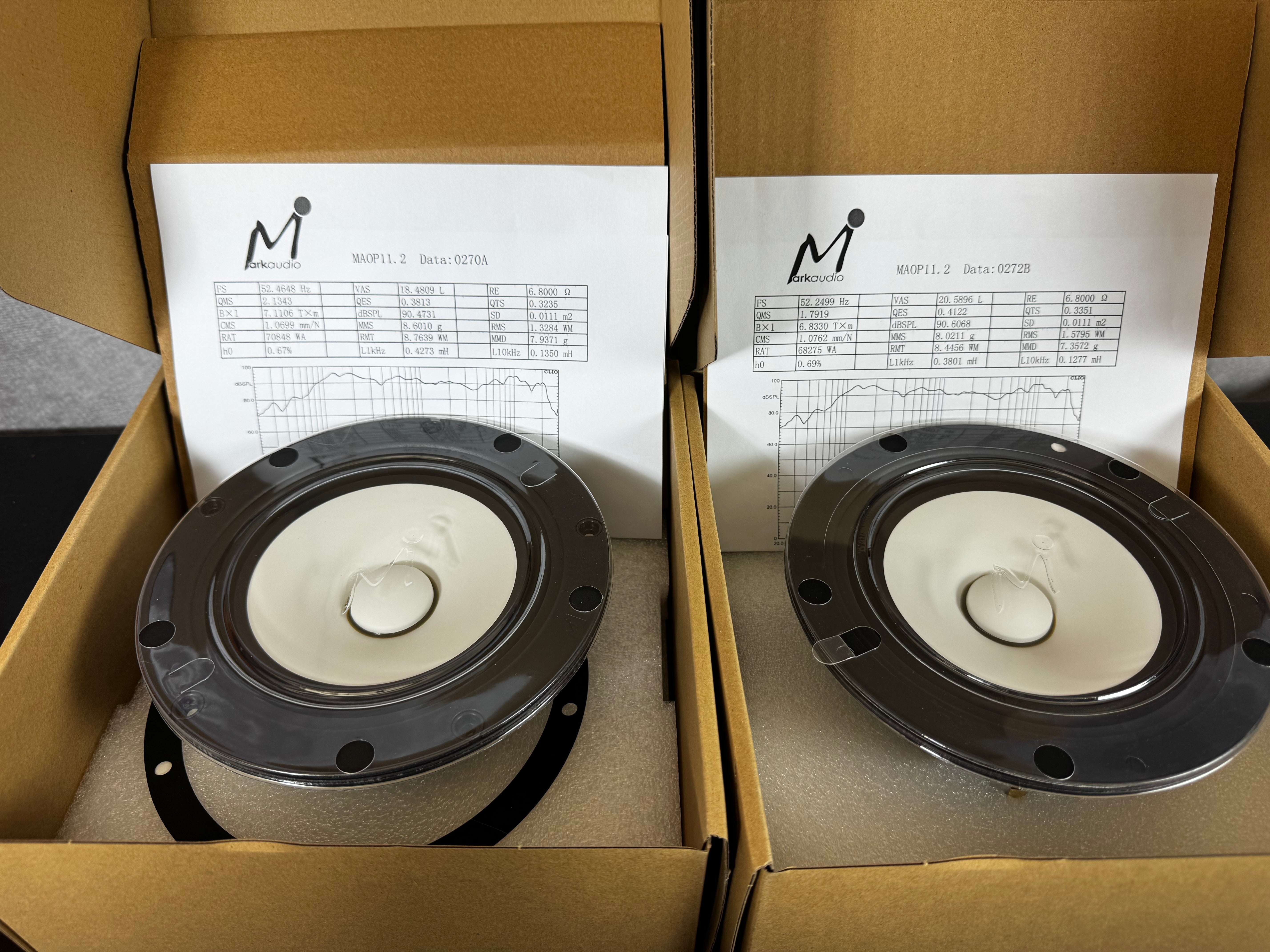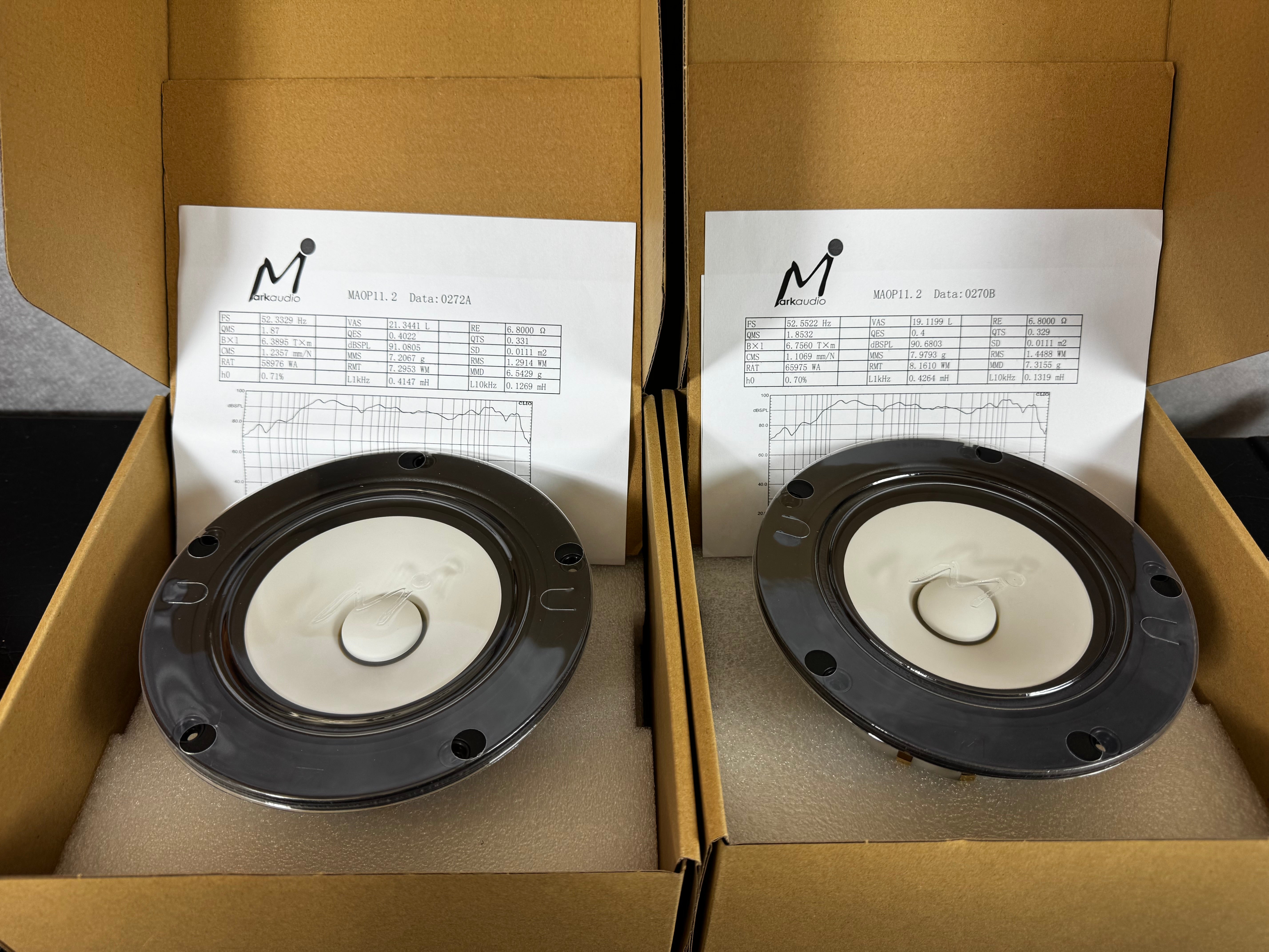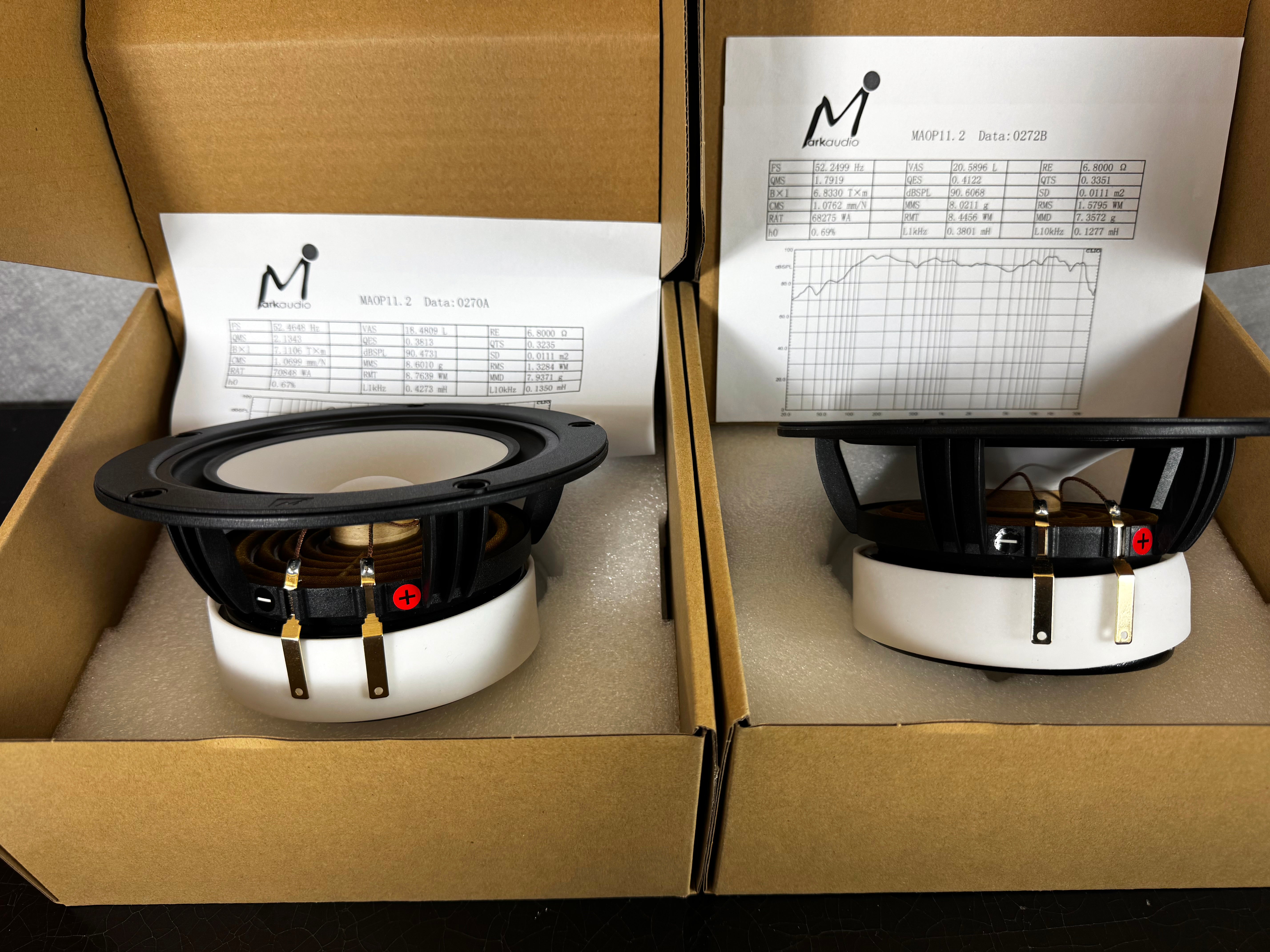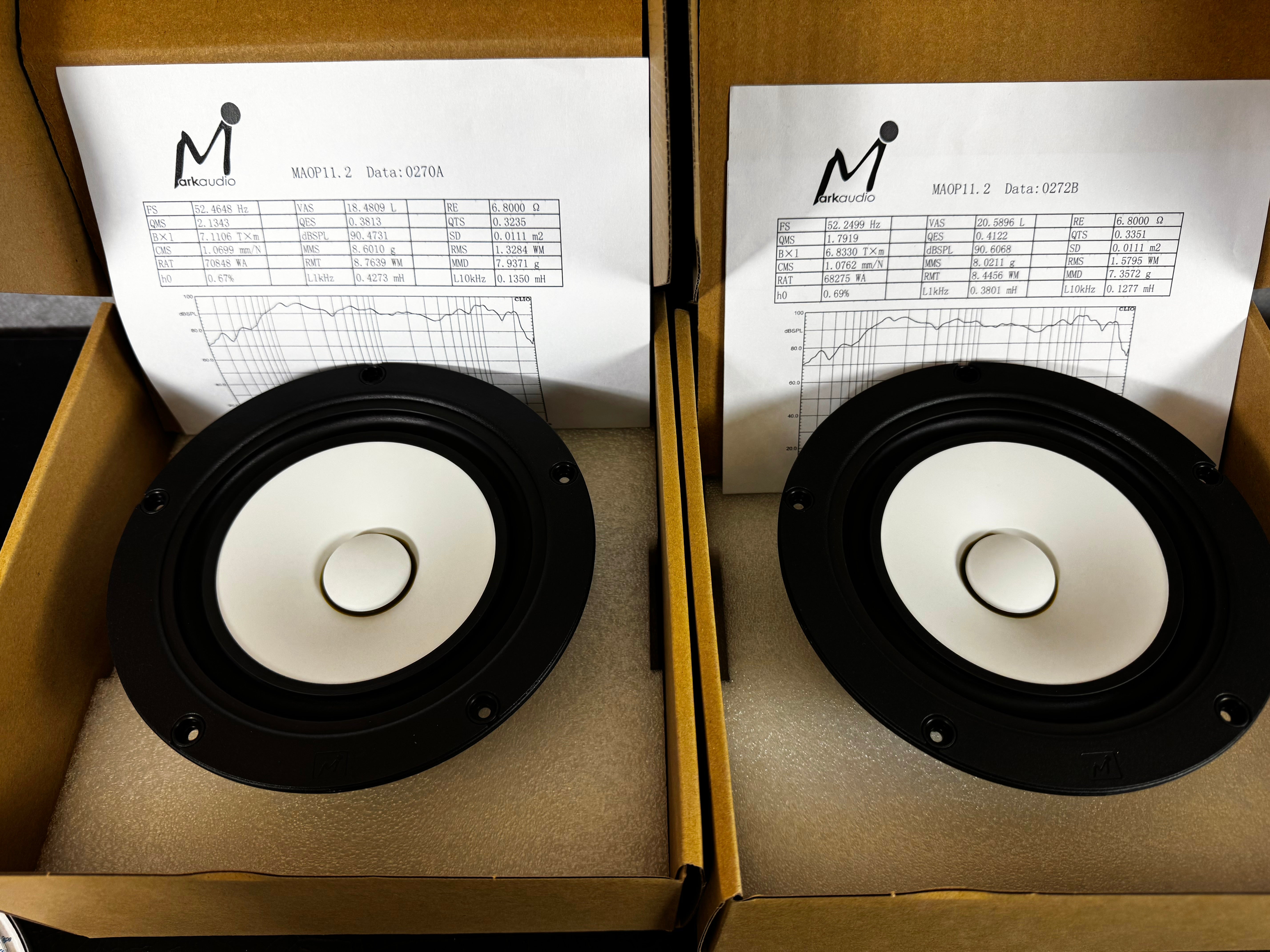 After construction, each driver is individually measured in the anechoic chamber at the Markaudio factory and pair matched based on that data to within, 0.5% tolerance.  Each pair is supplied with individual electrical and acoustic measurements.